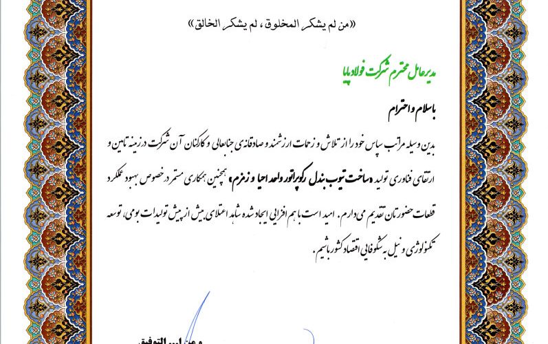 لوح تقدیر ساخت تیوب بندل رکوپراتور واحد احیا و زمزم فولاد خوزستان